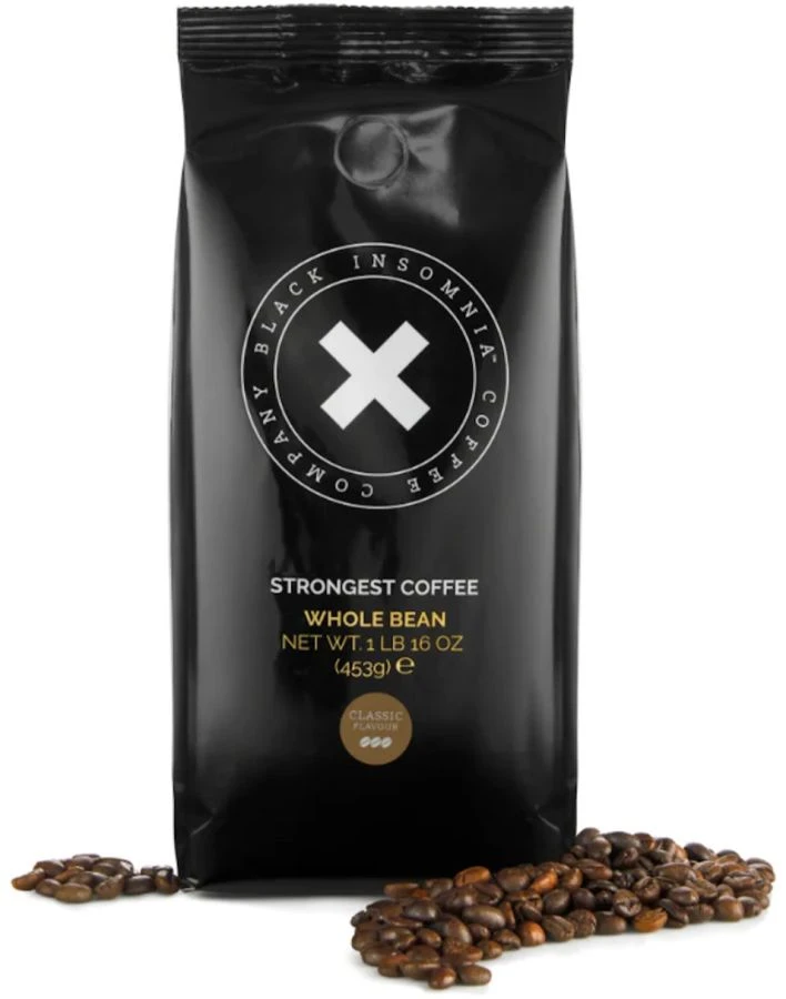 Black Insomnia Classic is a medium roasted coffee that’s light and refreshing. No acidity or bitterness with an extreme caffeine kick of 1105 mg caffeine per 350 ml cup.